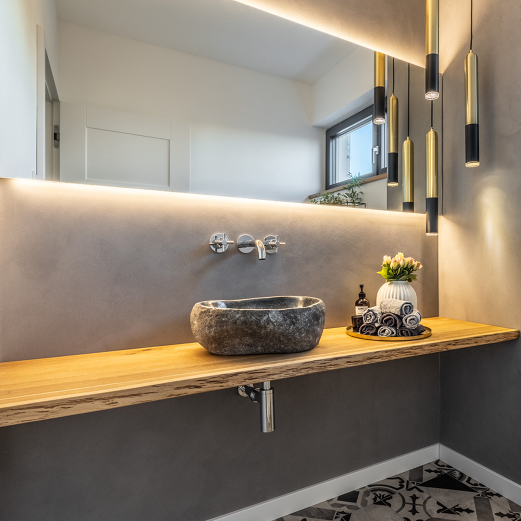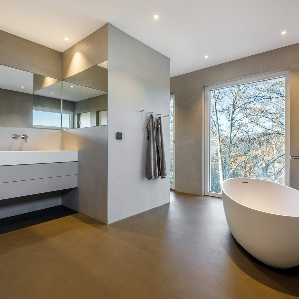 Sichtbeton ist extrem robust und widerstandsfähig. Mit einer Imprägnierung auch in deinem Nass- und Außenbreich langfristig einsetzbar.